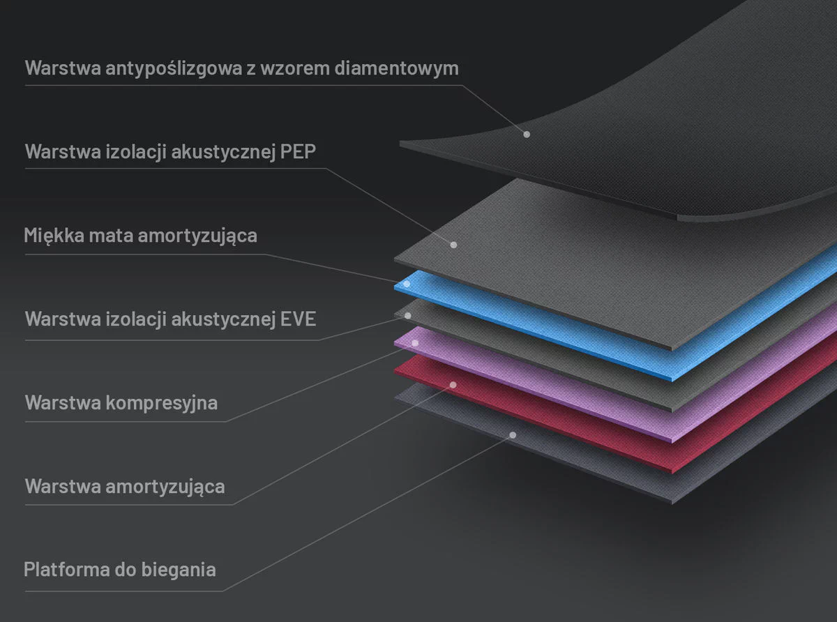 - Antypoślizgowy, 5-warstwowy pas biegowy: Zapewnia przyczepność podczas biegu.