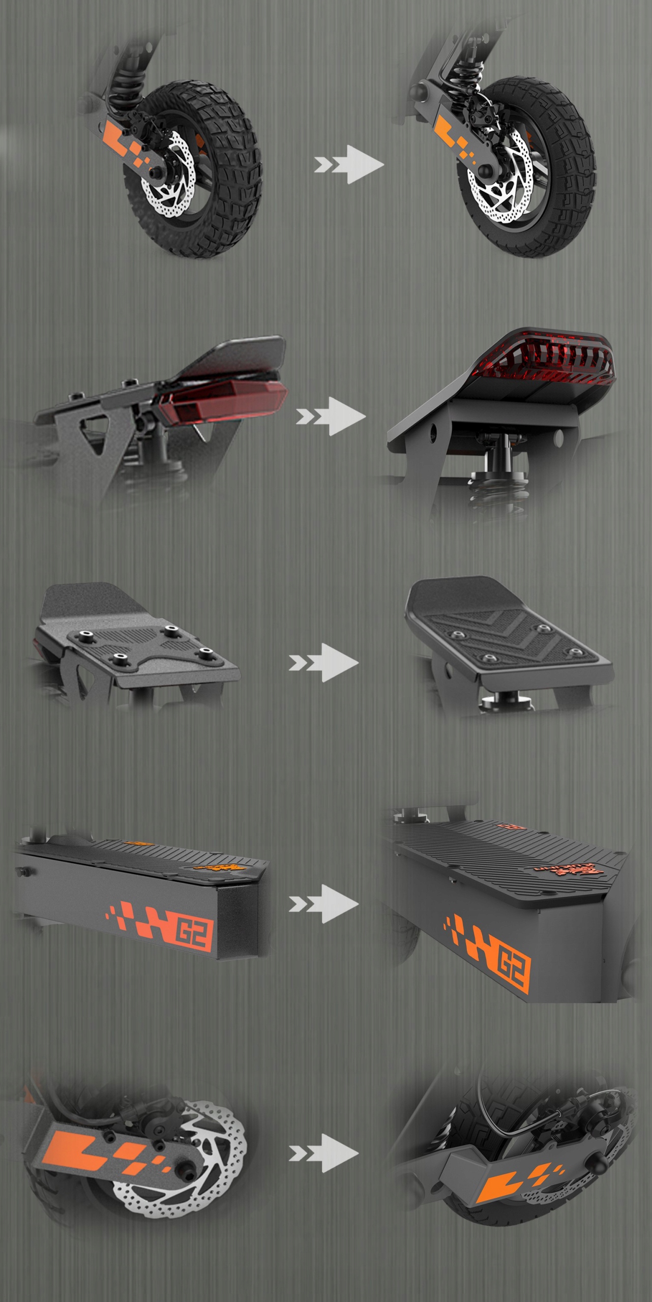 - Zintegrowana konstrukcja pedałów: Nowa wersja G2 wykorzystuje nową, zintegrowaną konstrukcję pedałów, która nie tylko poprawia estetykę, ale co ważniejsze, znacznie zwiększa wodoodporność, dzięki czemu jazda będzie bezstresowa.(Modernizacja z 140 mm do 160 mm)