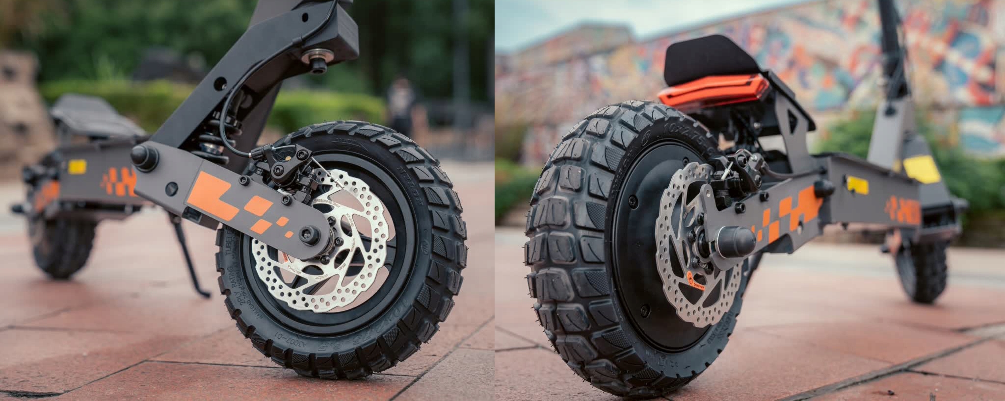KuKirin G2 jest wyposażony w 10-calowe terenowe opony próżniowe oraz przednie i tylne amortyzatory sprężynowe, których doskonała przyczepność i amortyzacja zapewniają płynną jazdę w każdych warunkach drogowych. Konstrukcja opon próżniowych zmniejsza ryzyko przebicia oraz zwiększa bezpieczeństwo i komfort jazdy. Niezależnie od tego, czy jest to miejski asfalt, czy szutrowe szlaki na wsi, KuKirin G2 z łatwością sobie z tym poradzi, zapewniając Ci niezrównane wrażenia z jazdy.